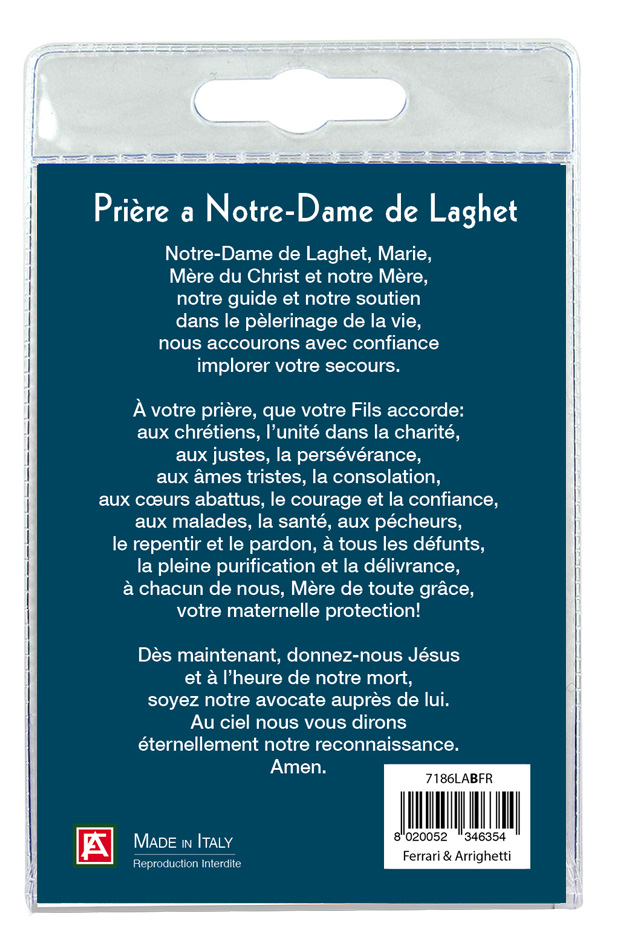 Il blister si presenta con all'interno un cartoncino con l'immagine della Madonna di Laghet.