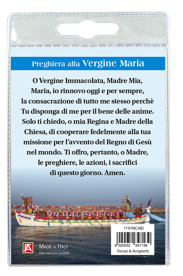 Il blister si presenta con all'interno un cartoncino rappresentante l'immagine della Madonna di Caorle, sul retro è stampata una preghiera in italiano dedicata alla Vergine Maria.