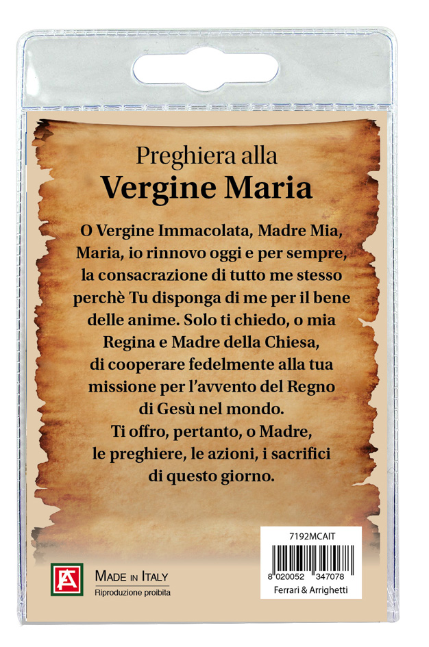 Il blister si presenta con all'interno un cartoncino, con la foto della Madonna dell'Angelo di Caorle e sul retro è stampata una preghiera a lei dedicata.