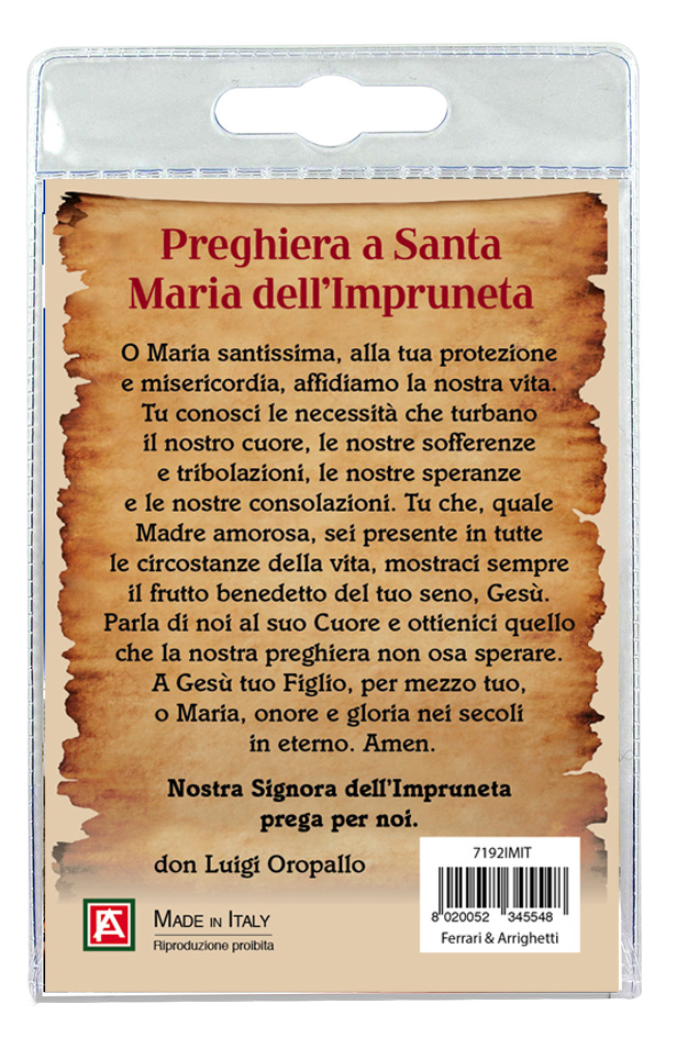 Il blister si presenta con all'interno un cartoncino, con la foto della Madonna di Impruneta e sul retro è stampata una preghiera a lei dedicata.