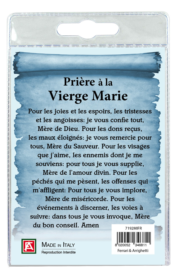 Il blister si presenta con all'interno un cartoncino, con la foto della Madonna Miracolosa e sul retro è stampata una preghiera in portoghese a lei dedicata.