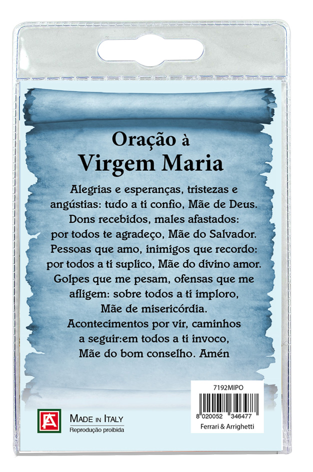 Il blister si presenta con all'interno un cartoncino, con la foto della Madonna Miracolosa e sul retro è stampata una preghiera in portoghese a lei dedicata.