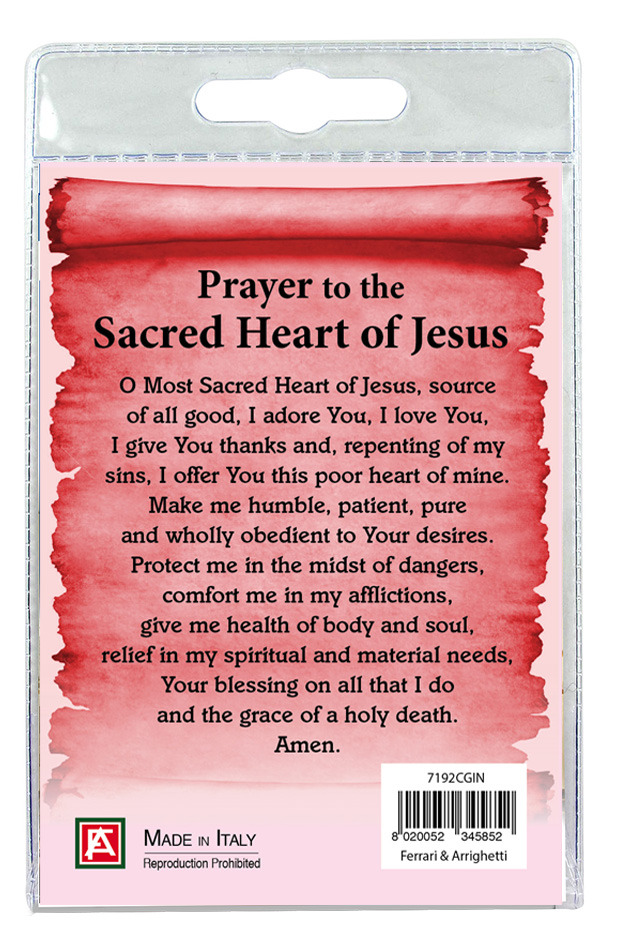 Il blister si presenta con all'interno un cartoncino con la foto del Sacro Cuore di Gesù e sul retro è stampata una preghiera a lui dedicata.