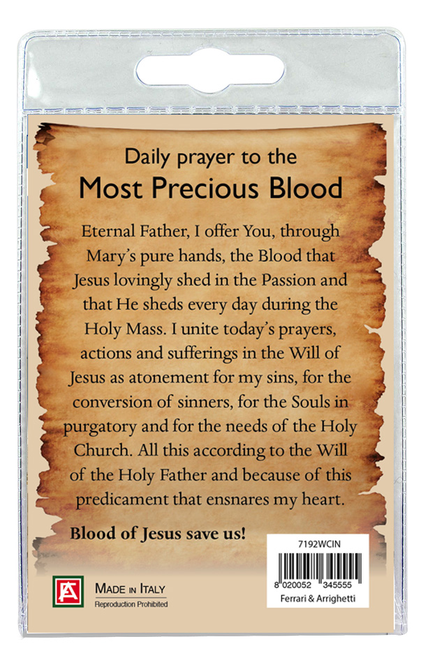 Il blister si presenta con all'interno un cartoncino, con la foto della Cattedrale di Westminster e sul retro è stampata una preghiera dedicata al Preziosissimo Sangue di Nostro Signore Gesù Cristo.
