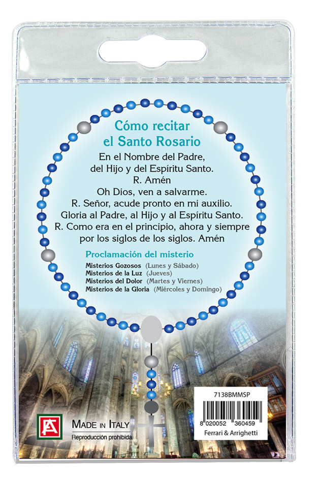 Il blister si presenta con all'interno un cartoncino, rappresentante la foto della Basilica di Santa Maria del Mar ed una decina con grani tondi in legno di mm 4 che, con gancetto si può applicare come ciondolo.