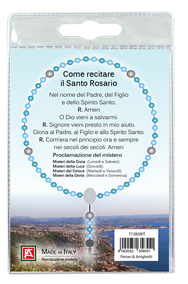 Il blister si presenta con all'interno un cartoncino, rappresentante la foto del Santuario di Monte Grisa ed una decina con grani tondi in legno di mm 4 che, con gancetto si può applicare come ciondolo.
