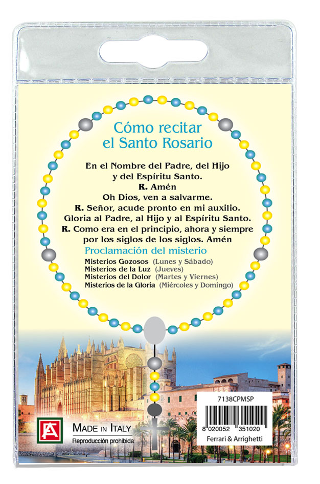 Il blister si presenta con all'interno un cartoncino, rappresentante la foto della cattedrale di Santa Maria (Palma Maiorca) ed una decina con grani tondi in legno di mm 4 che, con gancetto si può applicare come ciondolo.