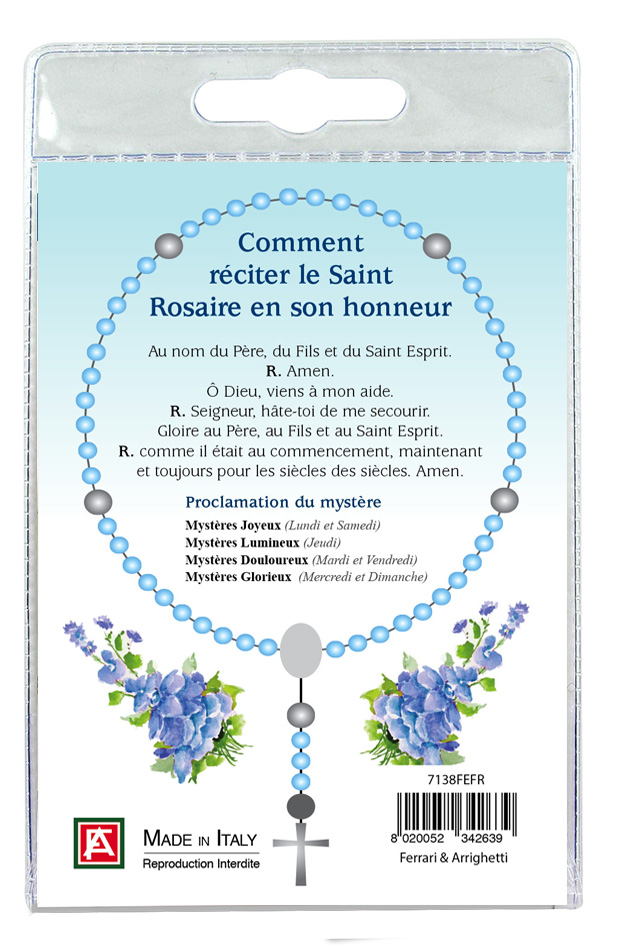 Sul retro del cartoncino è spiegato come si recita il rosario in francese.