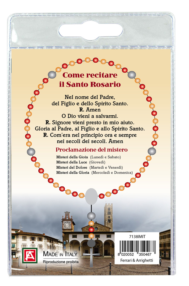 Sul retro del cartoncino è spiegato come si recita il rosario.