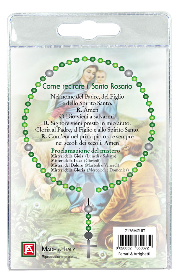 Sul retro del cartoncino è spiegato come si recita il rosario.
