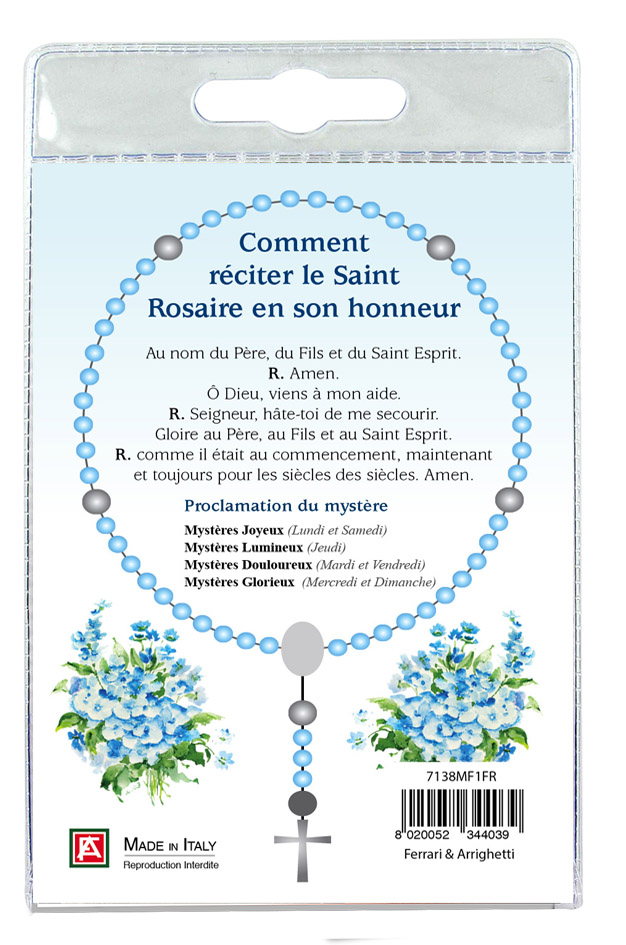 Sul retro del cartoncino è spiegato come si recita il rosario in francese.