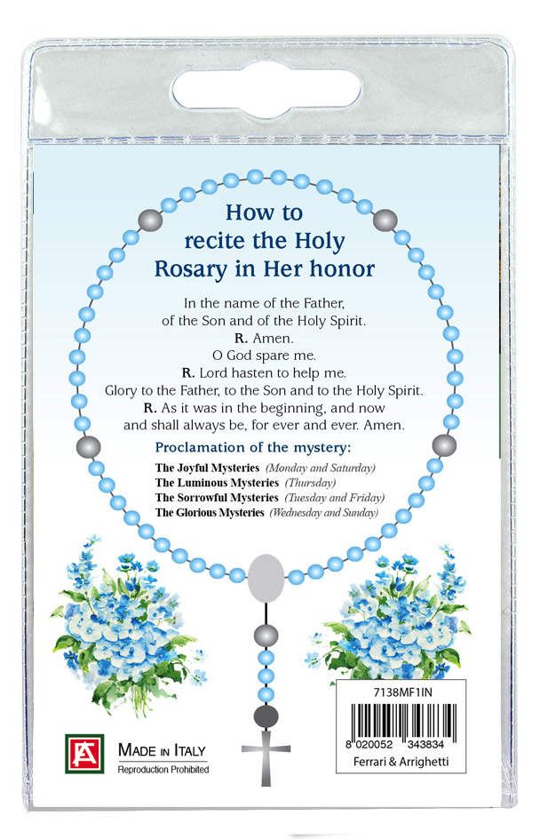 Sul retro del cartoncino è spiegato come si recita il rosario in inglese.