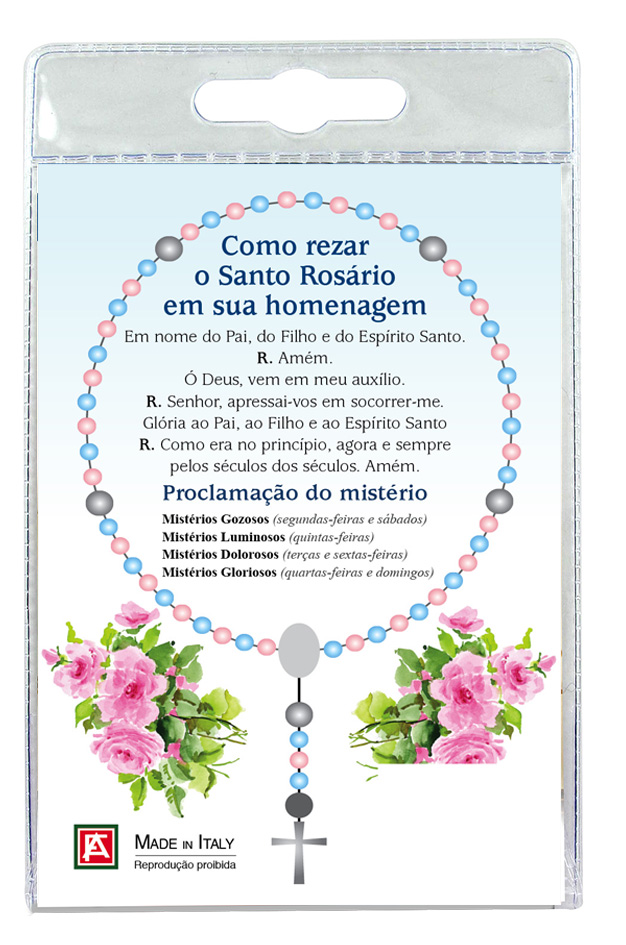 Sul retro del cartoncino è spiegato come si recita il rosario in portoghese.