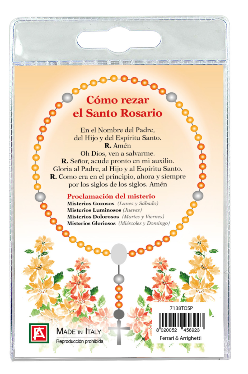 Sul retro del cartoncino è spiegato come si recita il rosario in spagnolo.