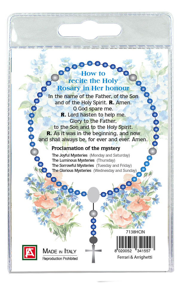 Sul retro del cartoncino è spiegato come si recita il rosario in inglese