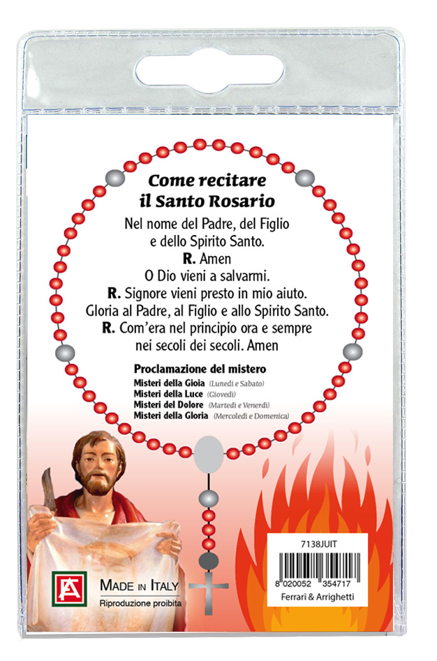 Il blister si presenta con all'interno un cartoncino, rappresentante la foto di San Giuda Taddeo ed una decina con grani tondi in legno di mm 4 che, con gancetto si può applicare come ciondolo.