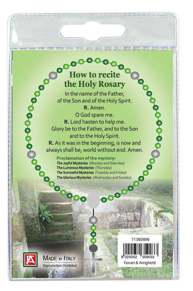 Il blister si presenta con all'interno un cartoncino, rappresentante la foto dell'apparizione di Santa Winefride ed una decina con grani tondi in legno di mm 4 che, con gancetto si può applicare come ciondolo.