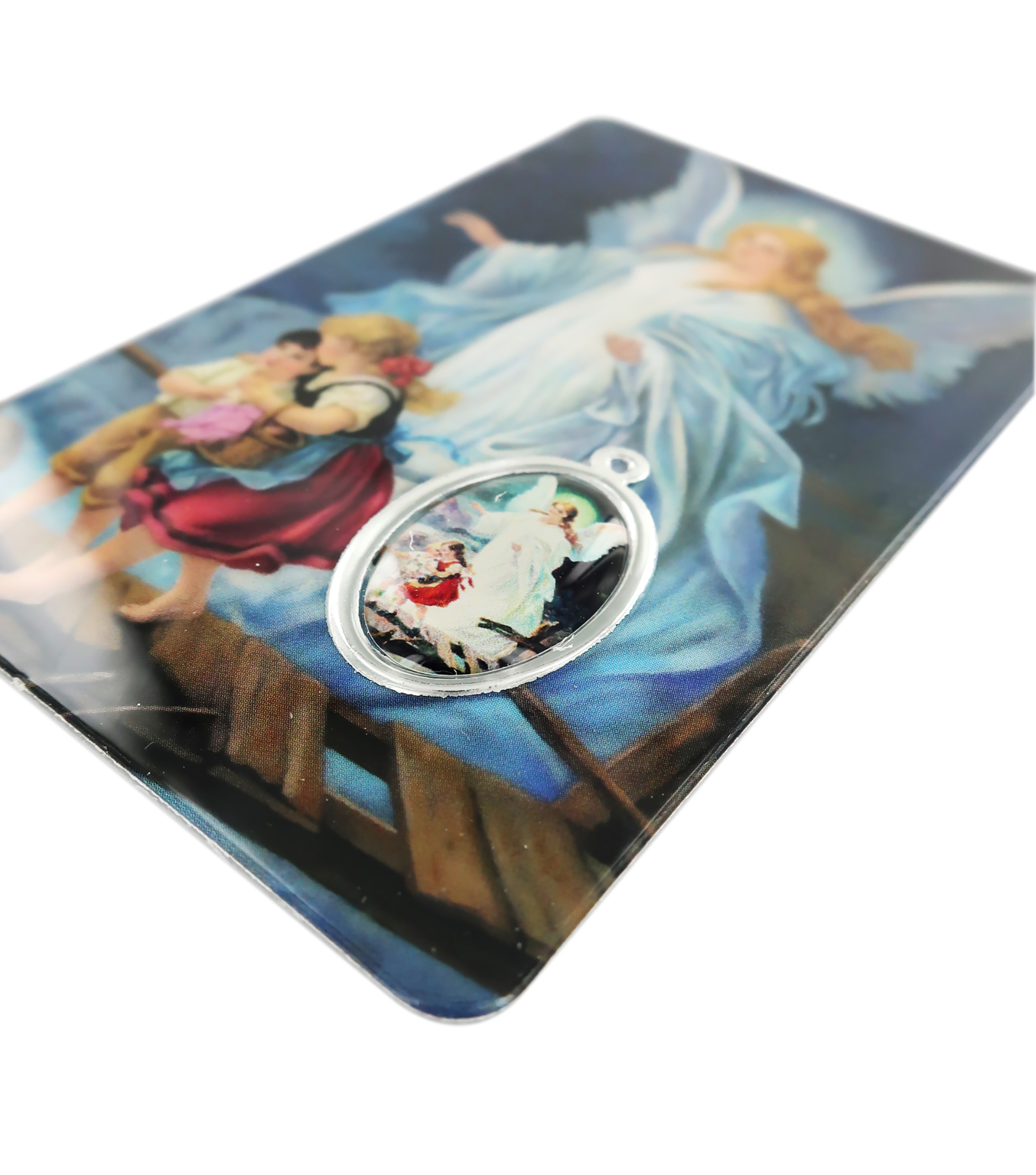 Questa immagine plastificata rappresenta l'Angelo Custode ed è impreziosita da una medaglia in resina a colori che ha attorno una cornice in argento a caldo. L'angelo custode è un angelo che, secondo la tradizione cristiana, acompagna ogni persona nella vita, aiutandola nelle difficoltà e guidandola verso Dio. L'angelo custode ha lo scopo principale di tenere il fedele lontalo dalle tentazioni e dal peccato.