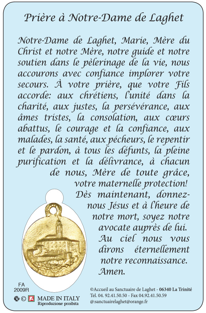 Card della Madonna di Laghet con sul retro una preghiera in francese a lei dedicata. Nella card è inserita una medaglia in metallo dorato raffigurante la Madonna di Laghet. La misura di questa card è di cm 5,5 x 8,5.
