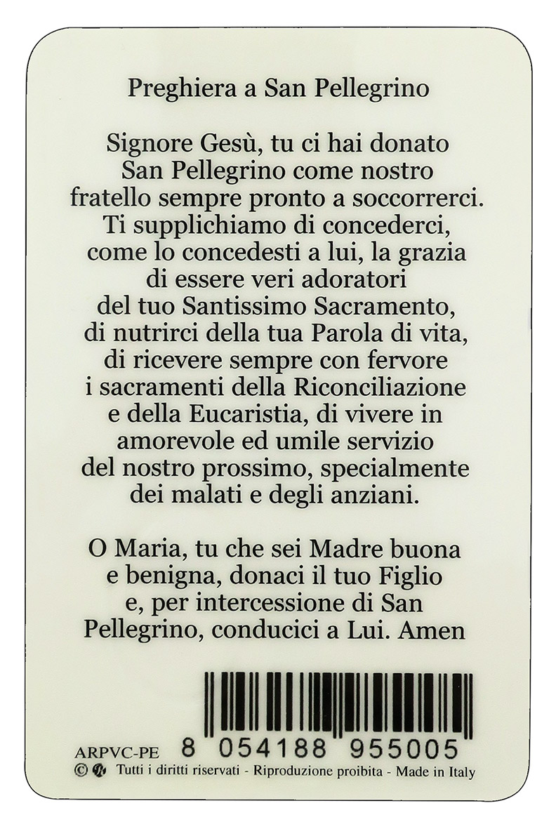 Questa immagine plastificata rappresenta San Pellegrino ed è impreziosita da una medaglia in resina a colori che ha attorno una cornice in argento a caldo.
