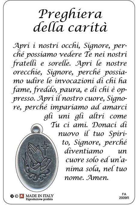 Card di Santa Madre Teresa di Calcutta con la preghiera della carità in lingua italiana. Nella card è inserita una medaglia resinata raffigurante Santa Madre Teresa di Calcutta. La misura di questa card è di cm 5,5 x 8,5.