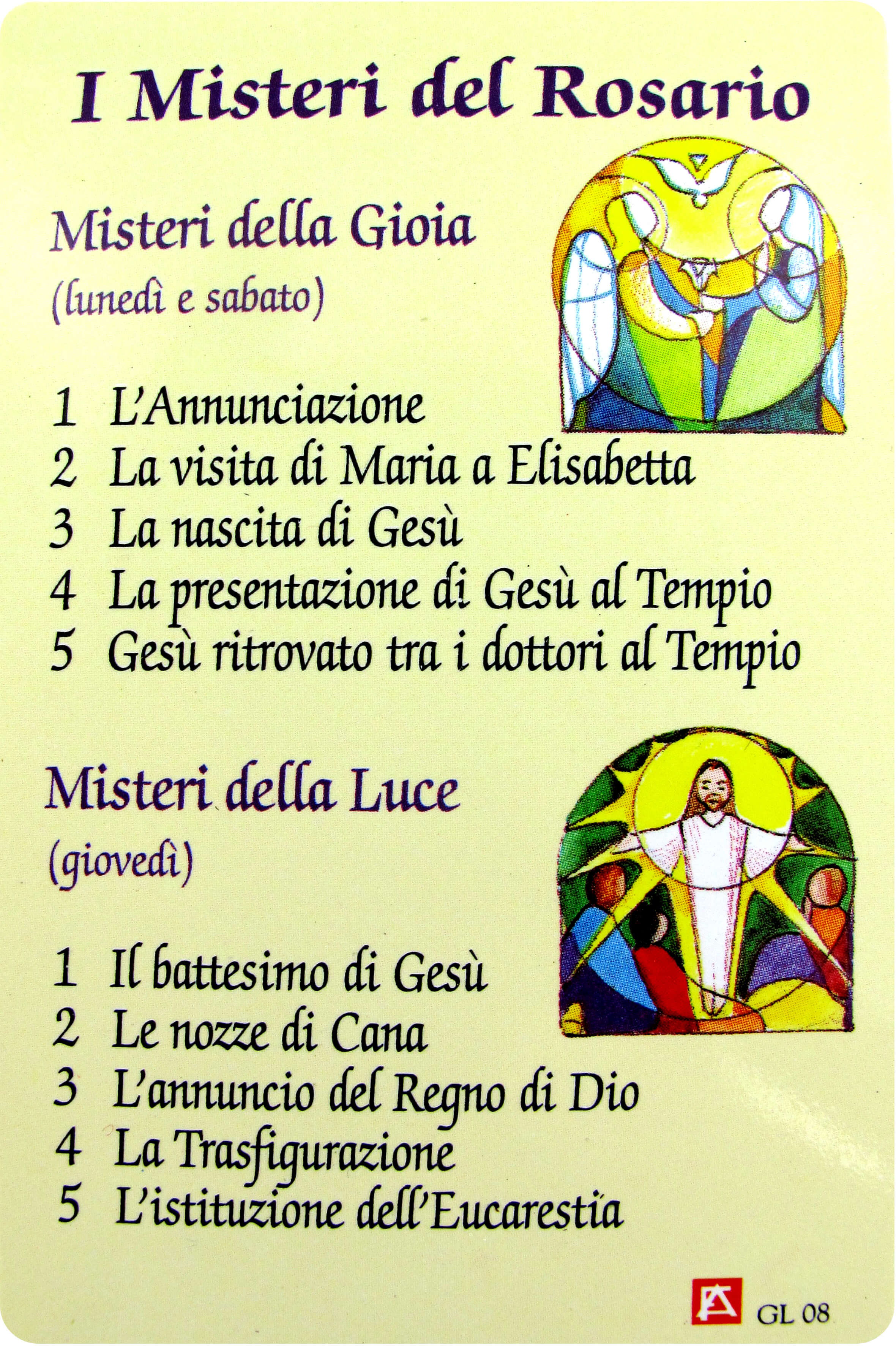 Immagine plastificata con i Misteri del Rosario: da un lato i Misteri del Dolore e i Misteri della Gloria e dall'altra parte i Misteri della Gioia e i Misteri della Luce. Misteri del Dolore: 1. Gesù al Getsemani 2. La flagellazione 3. L'incoronazione di spine 4. La salita al Calvario 5. La morte in Croce. Misteri della Gloria 1. La Resurrezione 2. L'Ascensione 3. La discesa dello Spirito Santo 4. L'Assunzione di Maria al Cielo 5. Maria incoronata regina degli Angeli e dei Santi Misteri della Gioia 1. L'Annunciazione 2. La visita di Maria a Elisabetta 3. La nascita di Gesù 4. La presentazione di Gesù al Tempio 5. Gesù ritrovato tra i dottori al Tempio Misteri della Luce 1. Il battesimo di Gesù 2. Le nozze di Cana 3. L'annuncio del Regno di Dio 4. La Trasfigurazione 5. L'istituzione dell'Eucaristia Il prodotto è completamente realizzato in Italia.