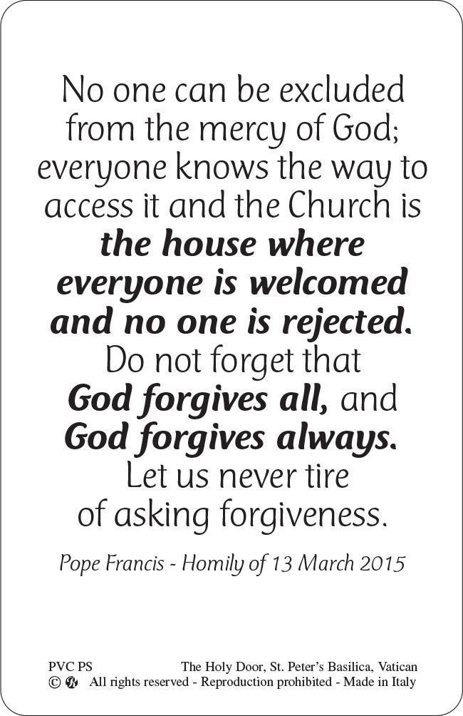 Questa immagine plastificata rappresenta la Porta Santa. La misura di questa card è di cm 5,5 x 8,5. Lingua: inglese. Materiale: PVC. Realizzato in Italia