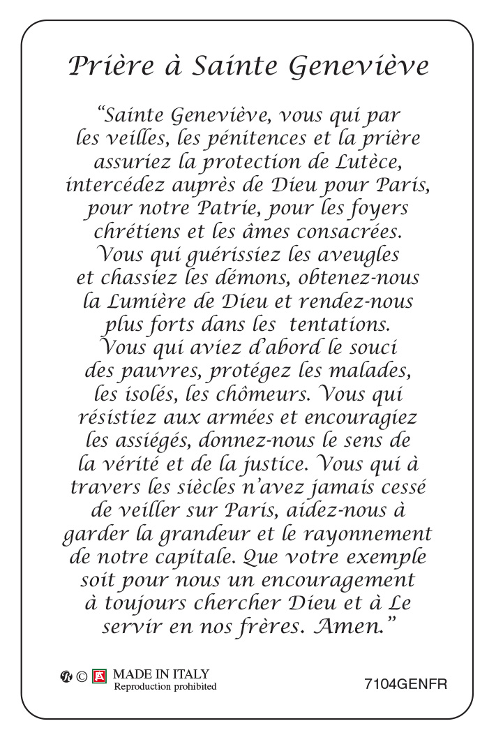 Questa immagine plastificata in PVC rappresenta Santa Genoveffa. Sul retro c'è una preghiera in francese a lei dedicata. La misura di questa card è di cm 5,5 x 8,5.