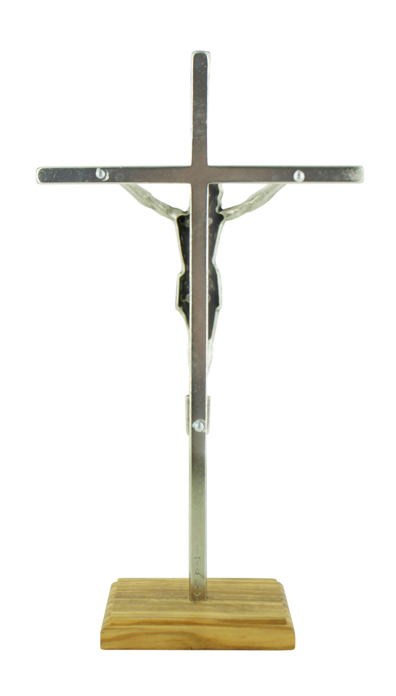 Croce da tavola in metallo argentato con la base di legno. L'articolo verrà consegnato in una scatola con finestra trasparente.