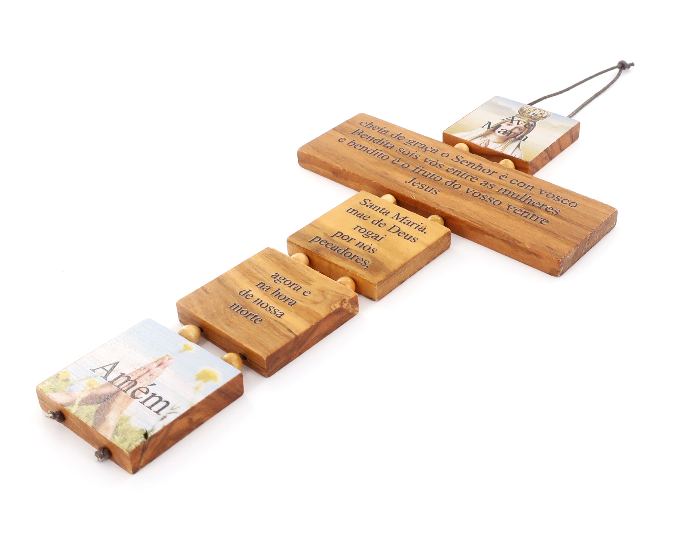 Croce Ave Maria in ulivo con immagini serigrafate Madonna di Fatima cm 19,5 in portoghese