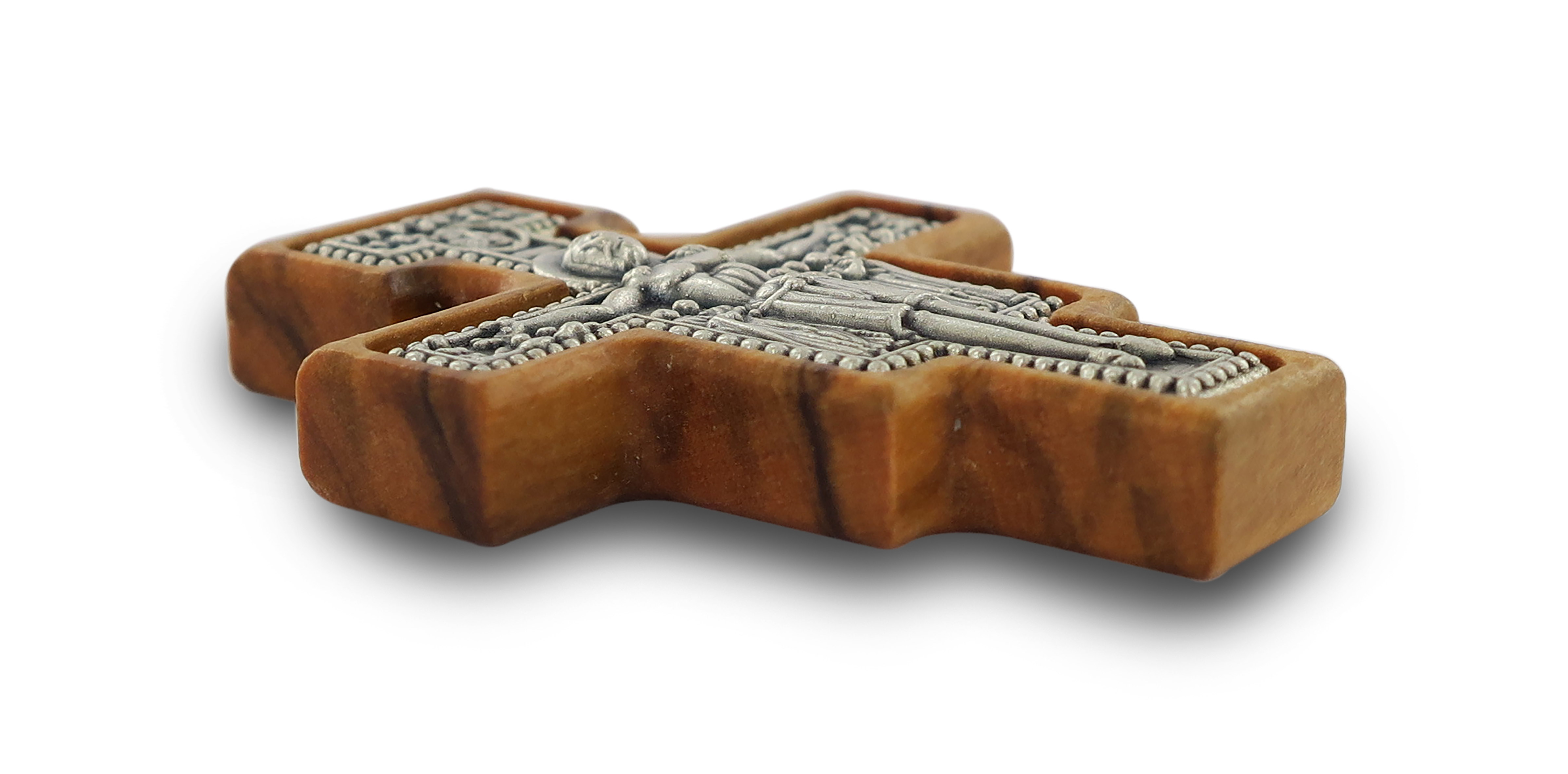 Croce San Damiano in metallo ossidato su legno ulivo con cordone - 4 x 3 cm