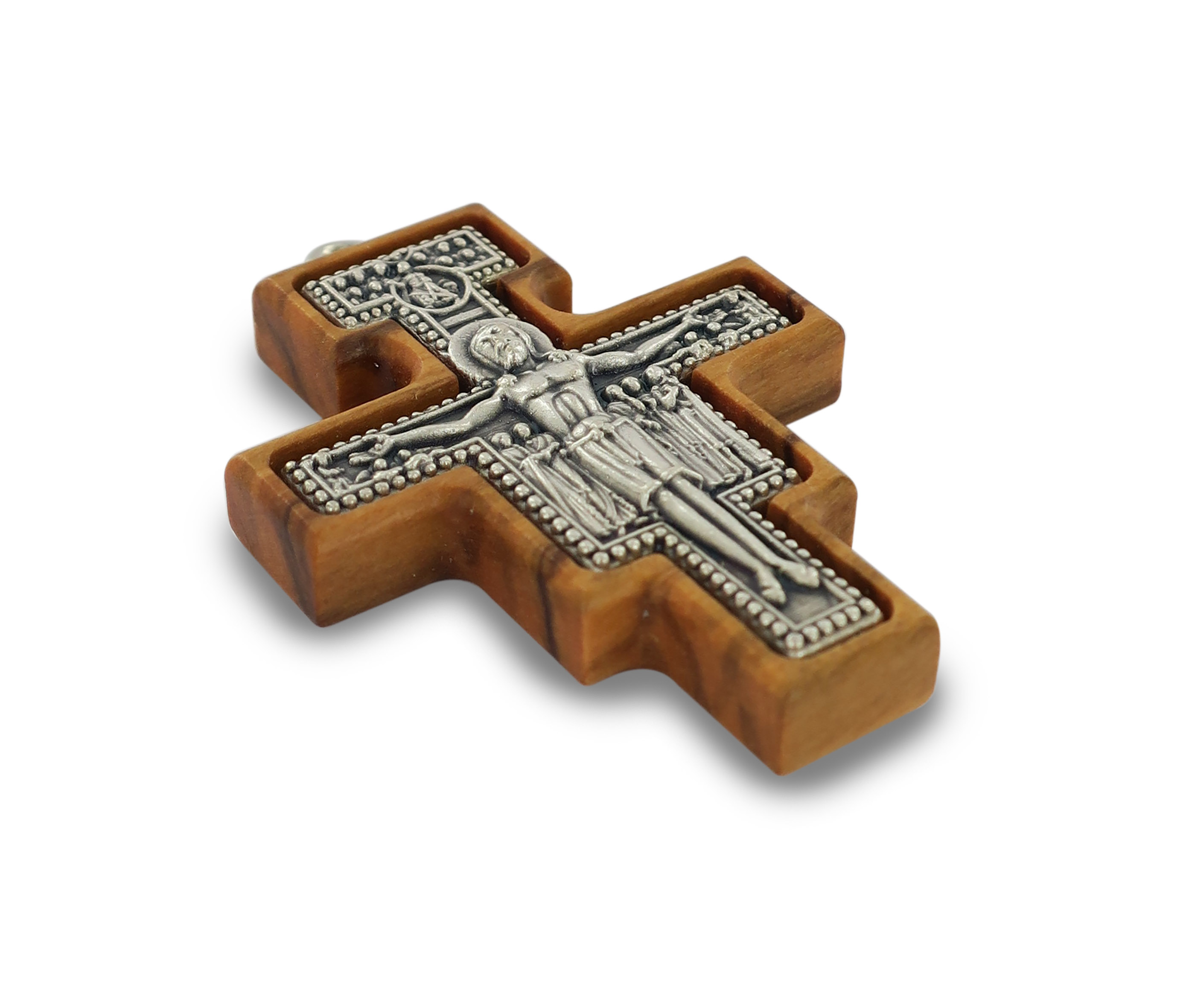 Croce pendente di San Damiano in metallo ossidato su legno d'ulivo, completa di cordone. Misure della croce: 4 x 3 cm. Realizzato in Italia.