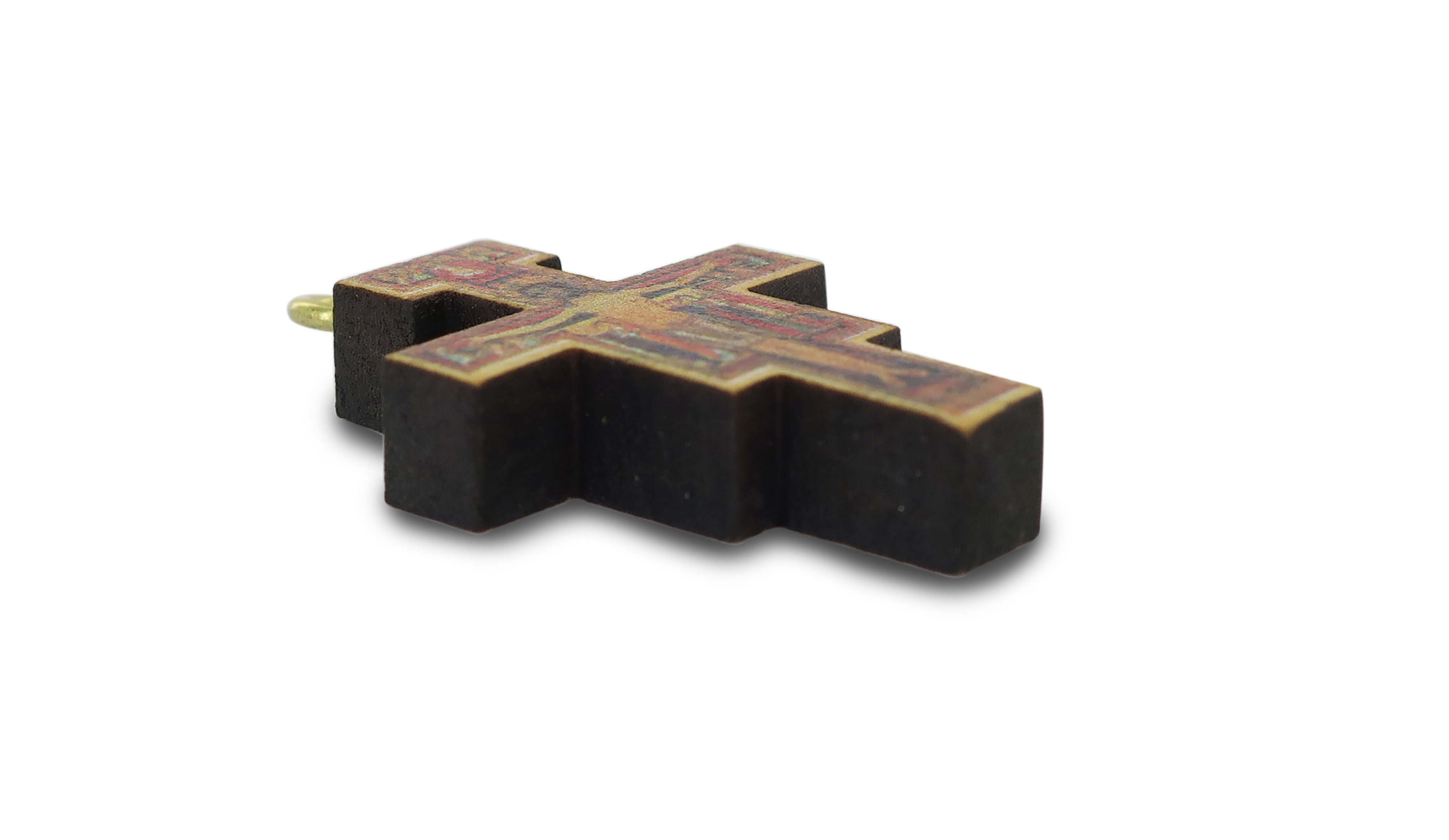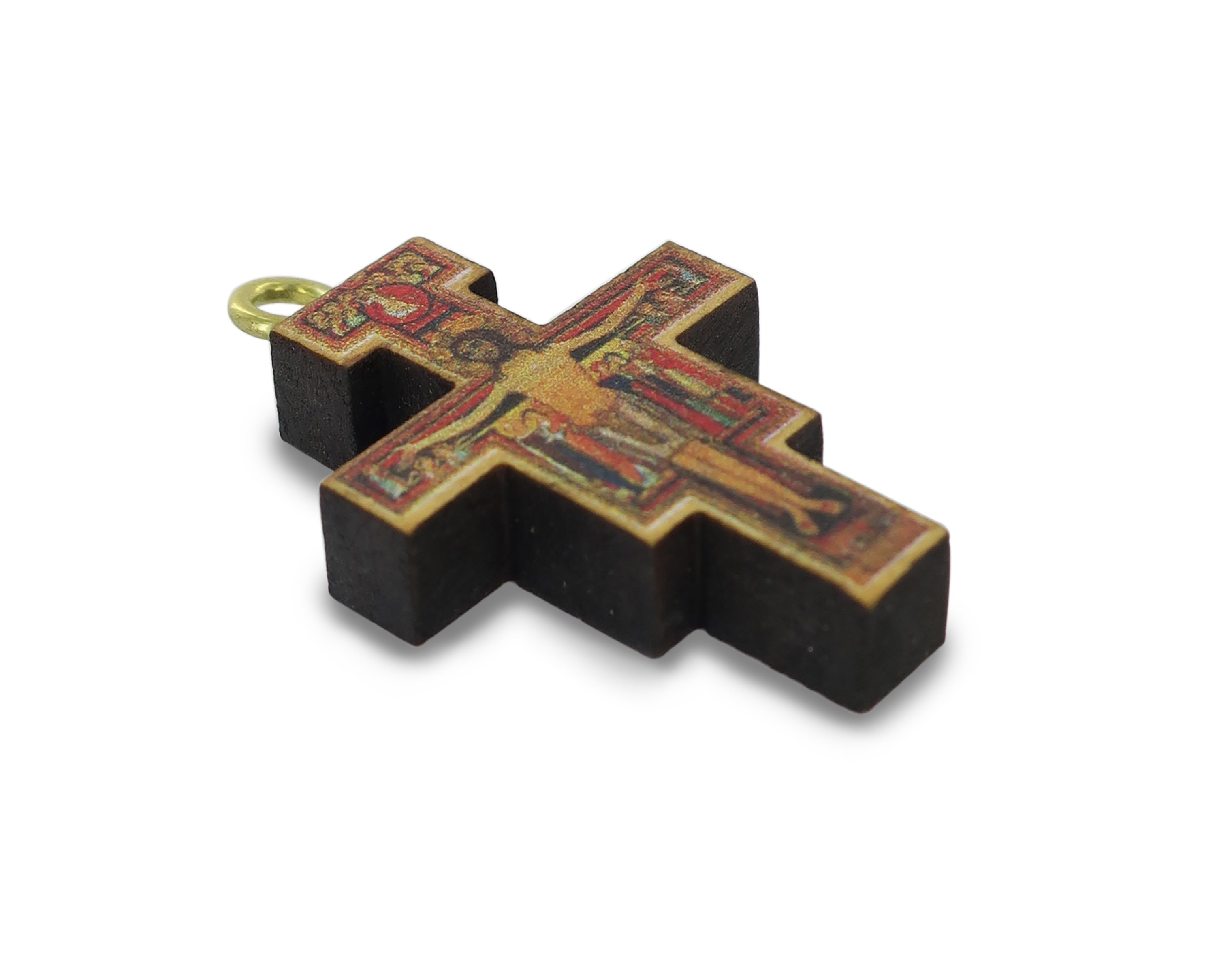 Croce pendente di San Damiano, completa di cordone. Si tratta di una stampa su legno d'ulivo. Misure della croce: 3x2 cm. Realizzato in Italia.