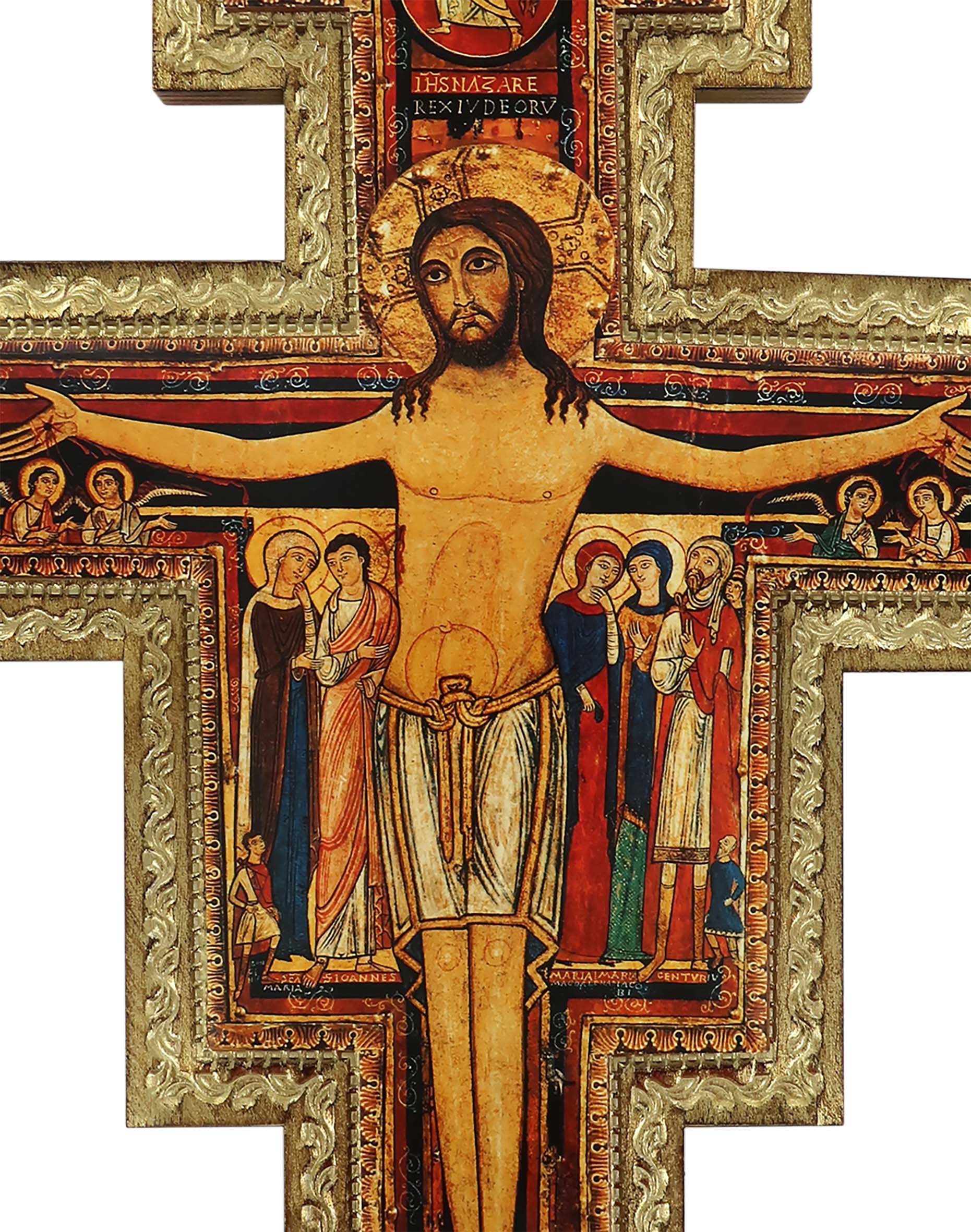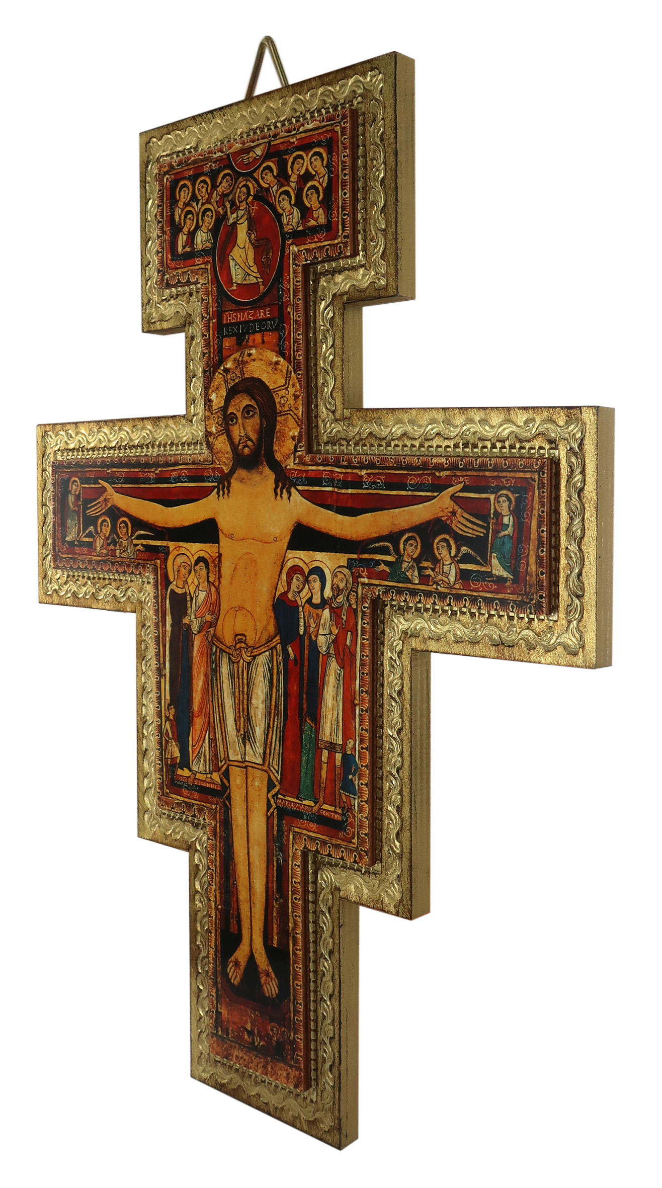 Questa croce in rilievo raffigura il Cristo apparso a San Francesco nella chiesa di San Damiano ad Assisi. Stampata su carta ed applicata su legno di pioppo con rilievo. L'immagine del crocifisso ha i bordi dei personaggi contornati color oro. Ideata per essere appesa alla parete.