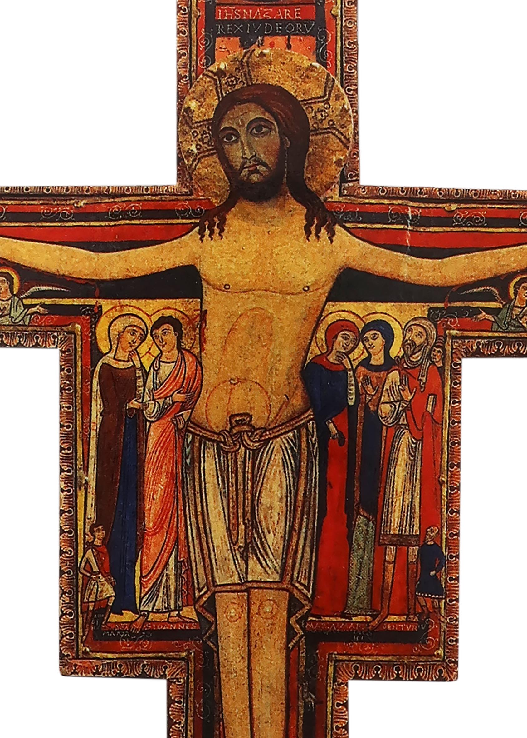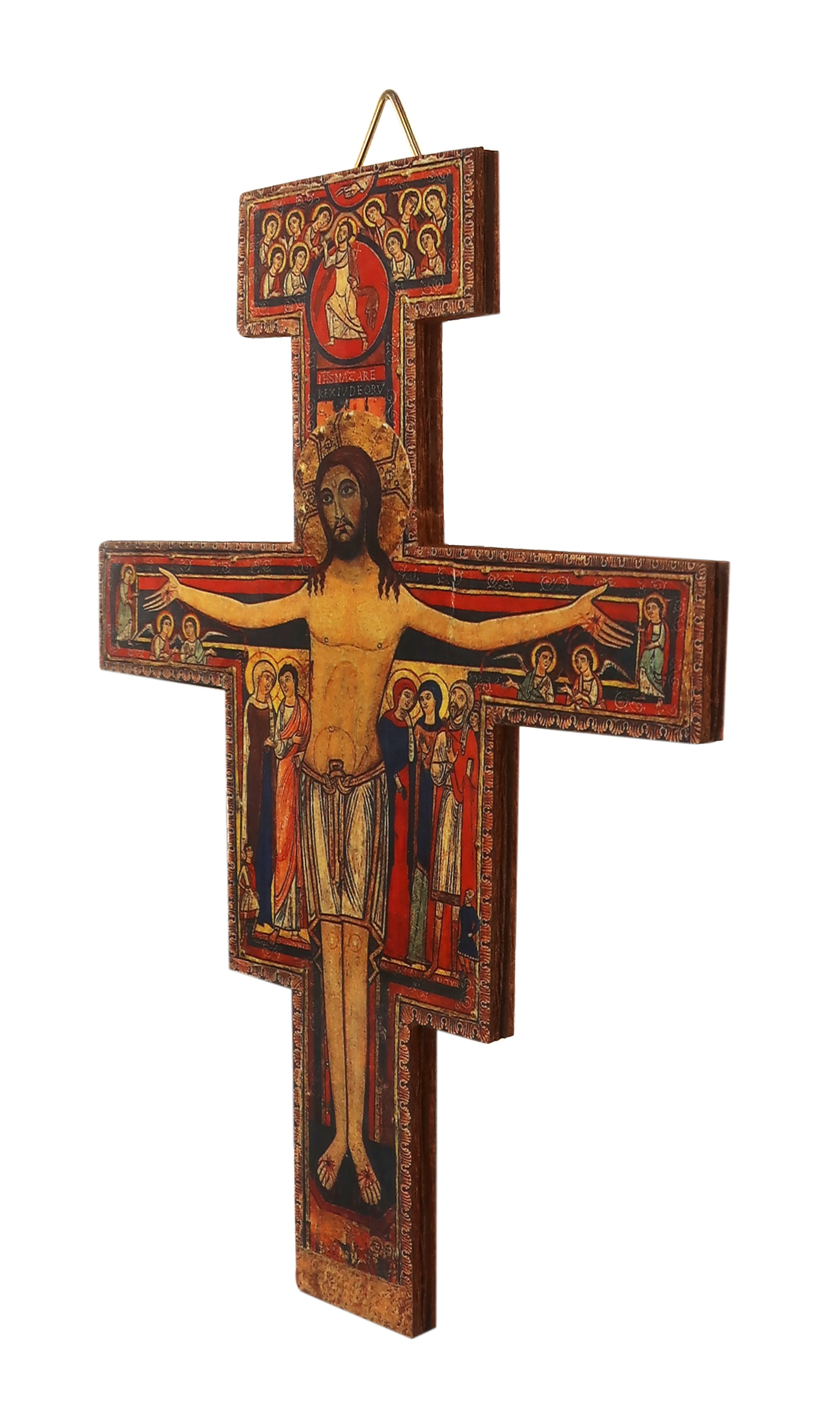 La croce rappresenta il Cristo apparso a San Francesco nella chiesa di San Damiano ad Assisi, stampato su carta applicata su legno di betulla dello spessore di cm 0,5.