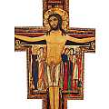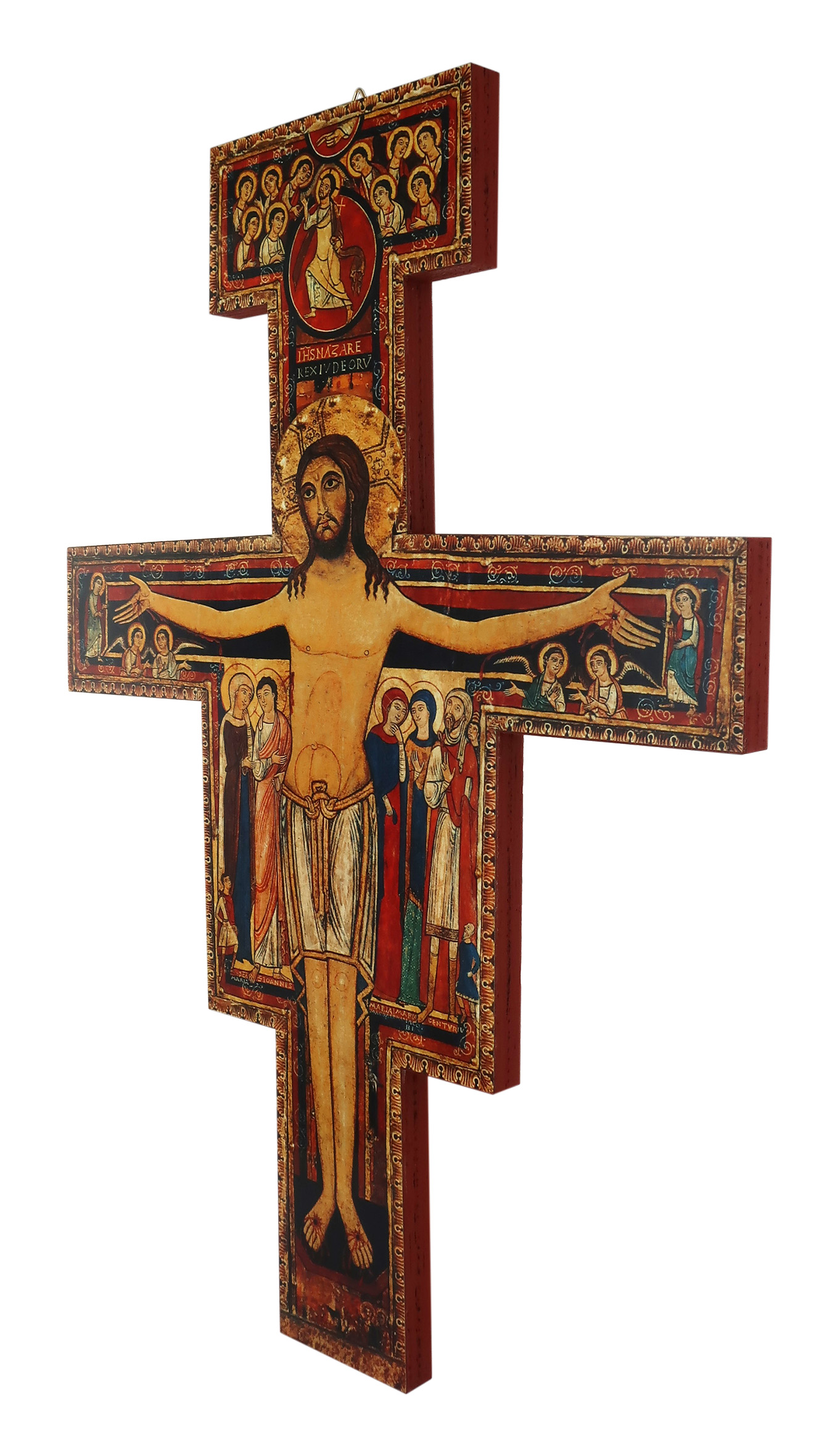 La croce rappresenta il Cristo apparso a San Francesco nella chiesa di San Damiano ad Assisi, stampato su carta applicata su legno di betulla dello spessore di cm 1,5.