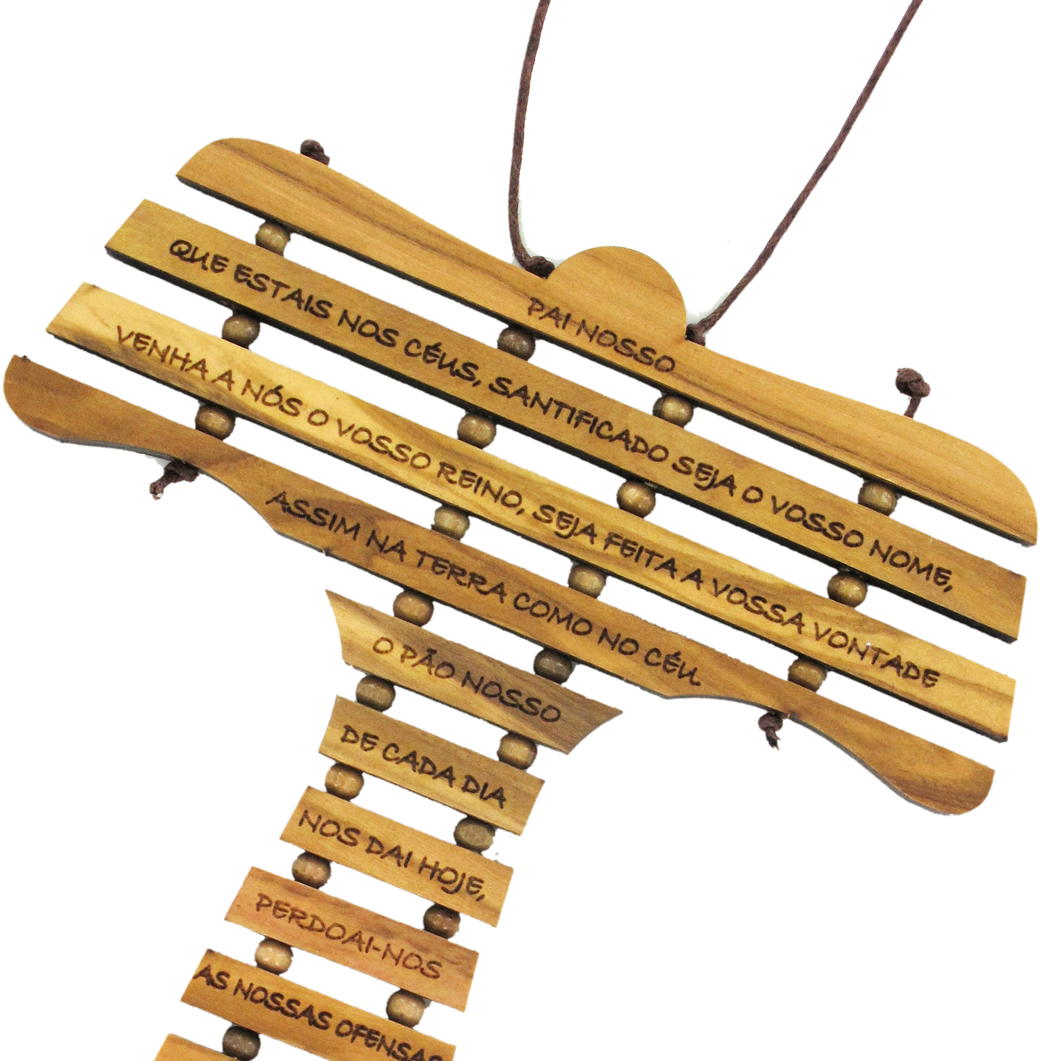 Croce Tau in ulivo con preghiera Padre Nostro in PORTOGHESE. La croce da muro è alta 19 cm. Dispone di comodo spago marrone all'estremità (lunghezza; 4,5 cm circa), che consente di appenderla al muro.