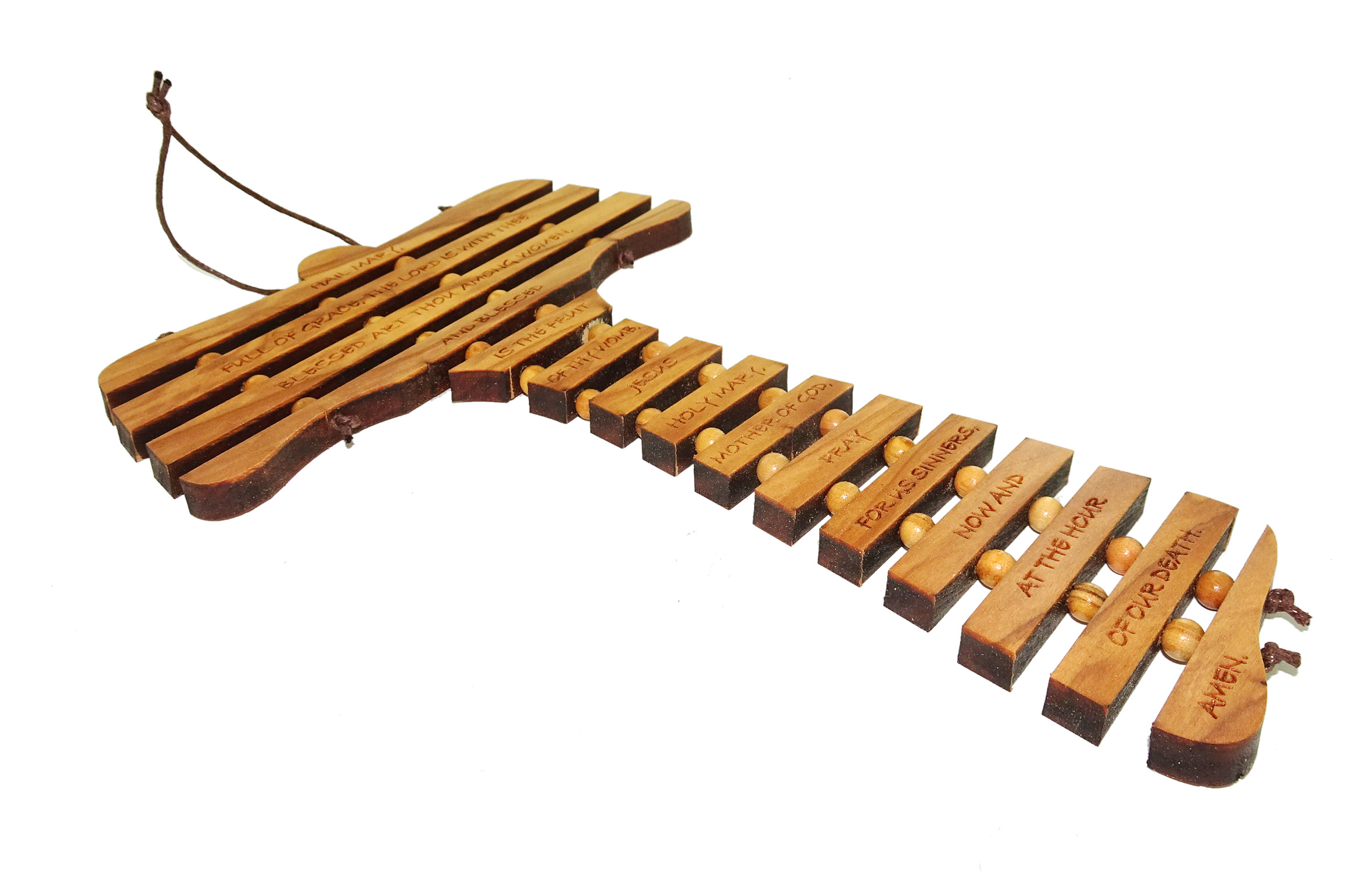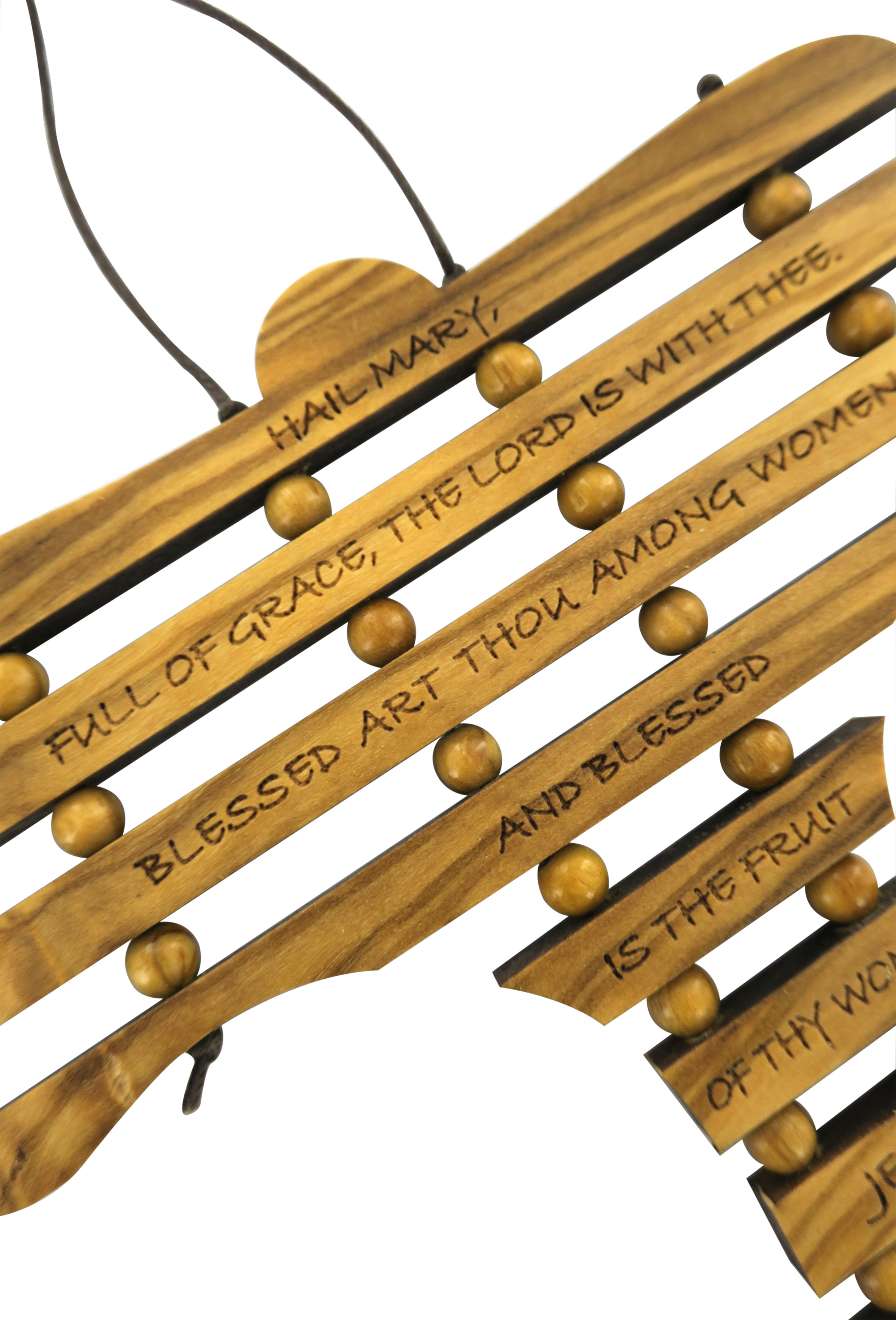 Croce Tau in ulivo con preghiera dell'Ave Maria in inglese, da 17 cm. La croce puo essere appesa alla parete. Il Tau è il segno concreto di una devozione cristiana, ma soprattutto un impegno di vita nella sequela del Cristo povero e crocifisso. Oggi, è generalmente considerata come simbolo degli ordini francescani e della redenzione.