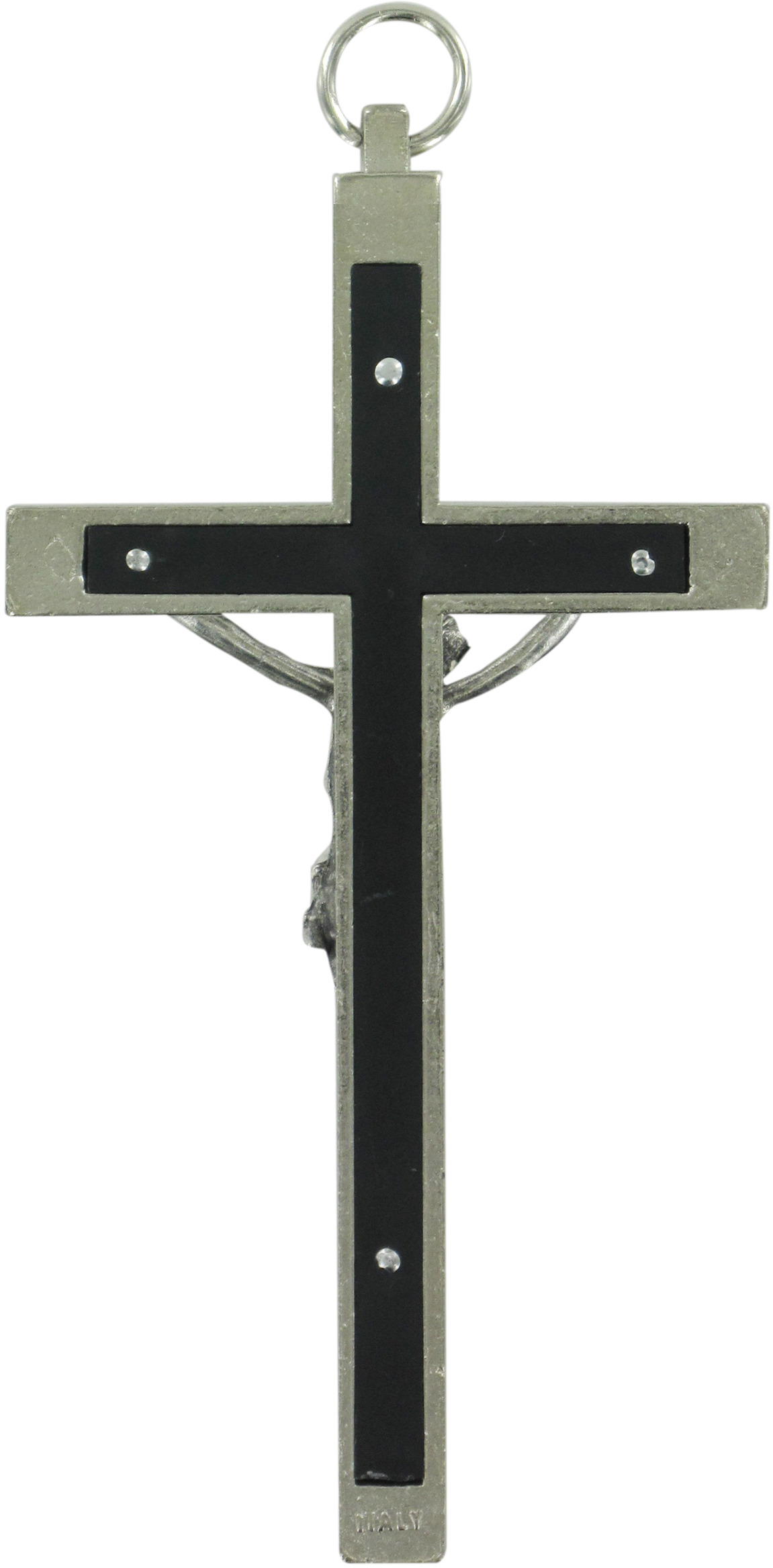 Croce in metallo nichelato con intarsio nero con riportatato Gesù in croce di misura 7,5 x 4 cm.