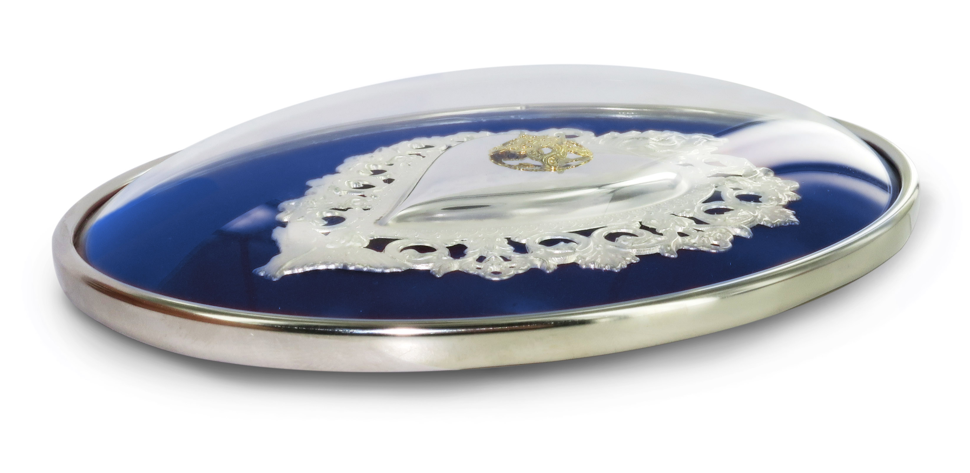 L' ex voto di forma ovale ha nel suo interno un cuore votivo in metallo lucido, appoggiato su di uno sfondo tipo velluto di colore blu che si presenta anche sul retro dove vi è una catenella in metallo nichelato con la quale viene appeso al muro della chiesa. Un piccolo profilo in metallo nichelato attornia l'ovale fermando il vetro bombato che ricopre il cuore. La misura è di cm 28 x 17. Il peso totale (comprensivo di scatola) è di gr. 312,50.