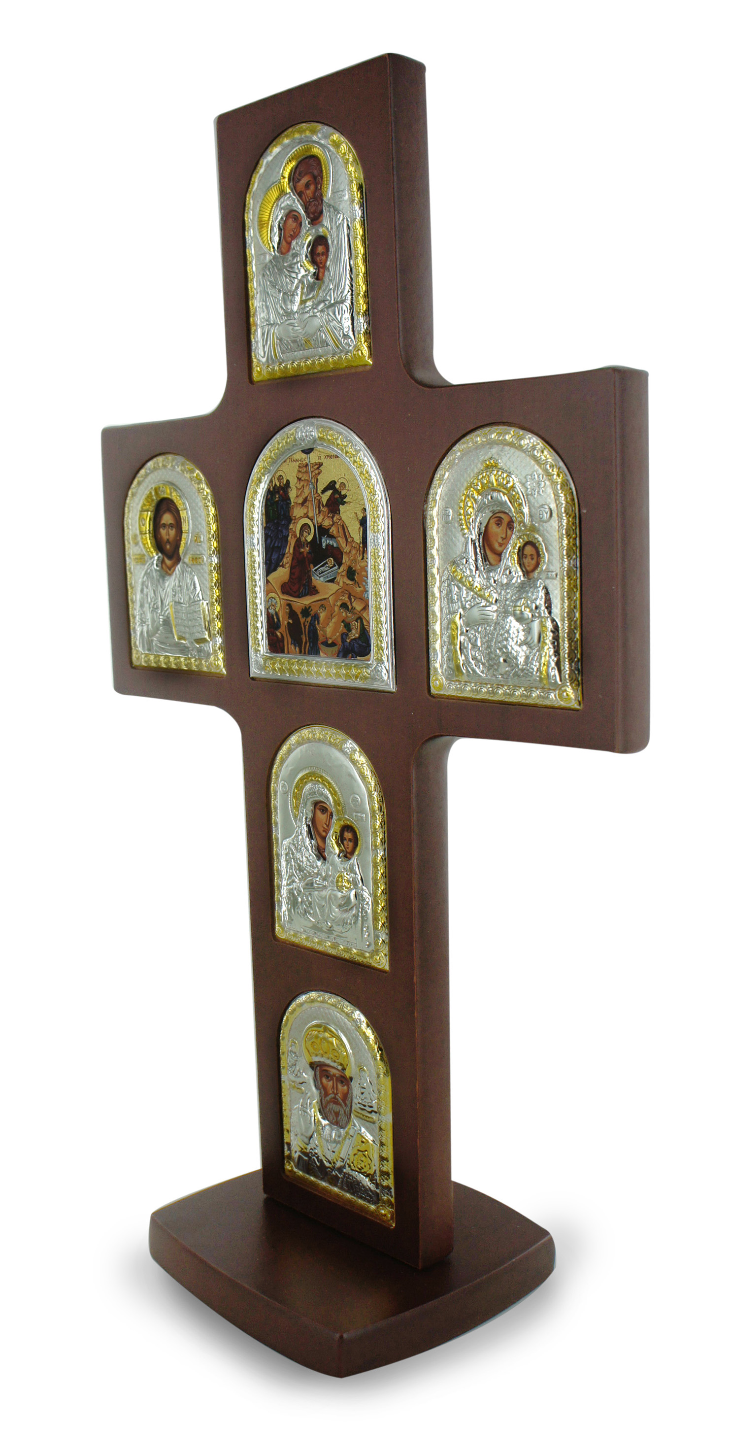 Croce da tavolo in legno con immagini sacre in argento - 32 cm