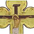 L'icona a forma di croce, dalle terminazioni trilobe, è profilata a mano in color bordeaux e celebra il Cristo morente. L'opera, una copia d'arte bizantina, è composta da una fine litografia incollata su legno e rifinita a mano: lo sfondo, impreziosito con foglia d'oro, è reso ancora più bello da scritte e aureole realizzate a mano di color rosso e da un effetto anticato. Lo spessore della croce icona, il suo bordo in rilievo dalla generosa smussatura e le sue estremità, che ricordano il trifoglio greco, fanno risaltare ulteriormente le forme e l'impatto visivo di questa croce da parete. Il gancio posteriore, infatti, consente di appenderla comodamente al muro.