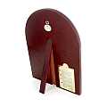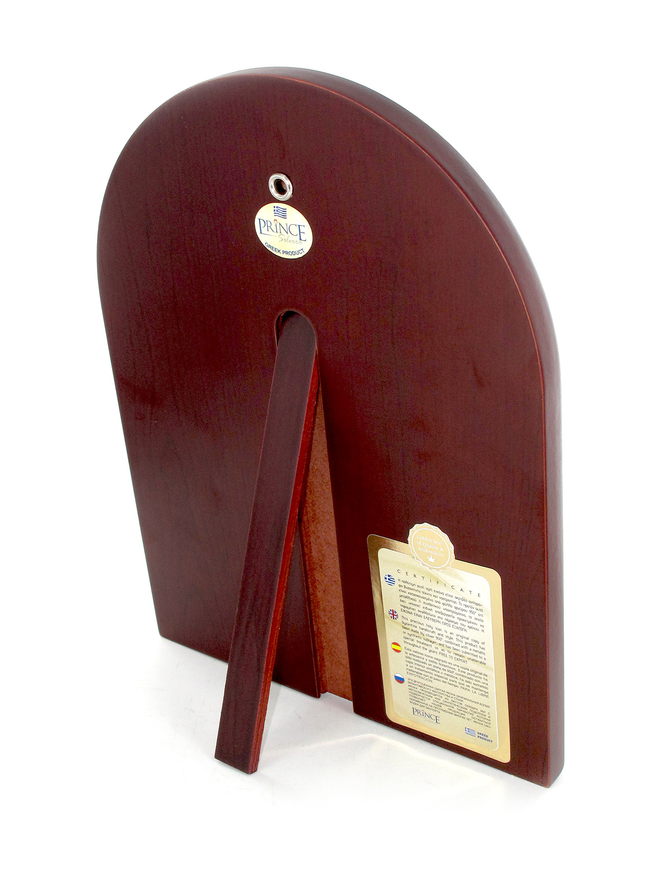 La placca in argento 925 è incastonata in un quadro di legno scuro a forma di arco, ed è impreziosita da finiture in oro e cristalli di vari colori.