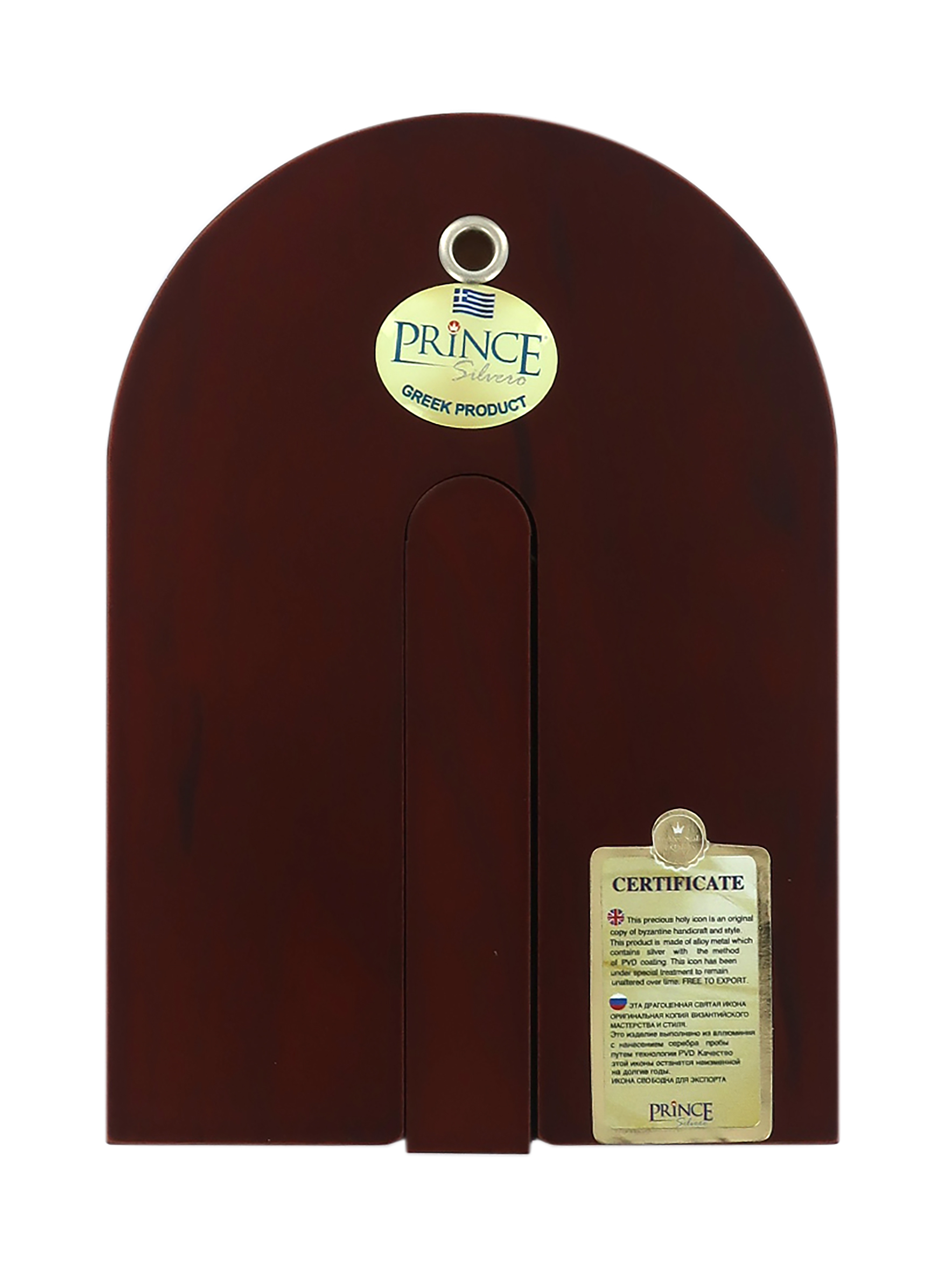 L'icona è inserita in un quadro ad arco di legno color mogano. Il quadro può essere sia appeso che appoggiato grazie al foro sul retro e ad un piedino d'appoggio presente all'interno della confezione.