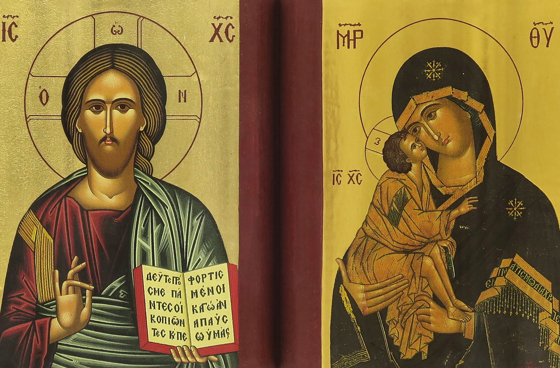 Dittico a forma di libro che raffigura la Madonna con Bambino e il Cristo Pantocratore. Quest'ultimo è rappresentato con il libro aperto e le dita della mano destra nella classica posizione benedicente, in perfetto stile ortodosso. La figura del Cristo Onnipotente, con il libro aperto, è fortemente simbolica e rimanda al concetto di diffusione del Verbo. In entrambe le immagini, i volti sono ben sfumati e lo sfondo, di color oro brillante, dona ulteriore risalto ai soggetti della rappresentazione.