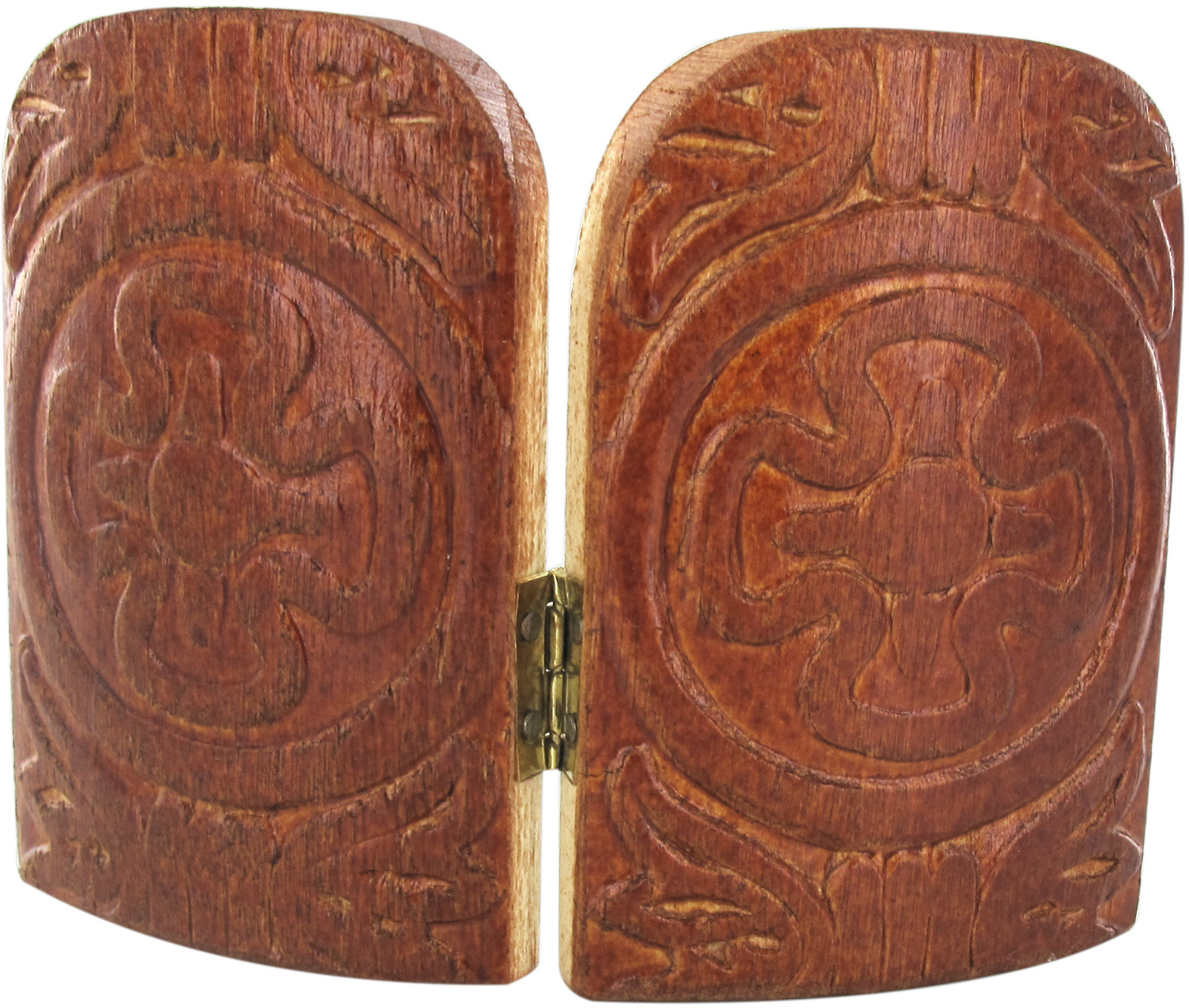 Dittico greco in legno dalle tonalità calde rossastre, con retro intagliato e cerniera metallica. Le raffigurazioni sui due pannelli, che ricordano lo stile delle icone, rappresentano Cristo Pantocratore e la Madre di Dio della tenerezza di Vladimir.