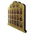 Il quadretto-icona è realizzato con litografie su carta incollate ad una tavola lignea, rifinite con scritte, aureole e bordi bordeaux tracciati a mano. Lo sfondo è abbellito da una rifinitura in foglia d'oro che renderà questa tavoletta illustrata alta 36,5 cm ancora più bella e lucente. Un leggero effetto dona un aspetto anticato all'icona. Le varie immagini vengono esaltate dallo spessa smussatura bordeaux che fa da contorno ai vari riquadri incassati in cui le figure trovano posto.
