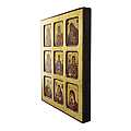 Il quadretto-icona è realizzato con litografie su carta incollate ad una tavola lignea, rifinite con scritte, aureole e bordi bordeaux tracciati a mano. Lo sfondo è abbellito da una rifinitura in foglia d'oro che renderà questa tavoletta illustrata alta 24,5 cm ancora più bella e lucente. Un leggero effetto dona un aspetto anticato all'icona. Le varie immagini vengono esaltate dallo spessa smussatura bordeaux che fa da contorno ai vari riquadri incassati in cui le figure trovano posto. Anche grazie a questa accortezza grafica, la grande icona appare come un'opera multi-soggetto.