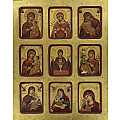 Questa icona da parete di legno presenta 9 immagini che raffigurano la Madonna, quasi sempre insieme al Bambino. Si tratta di un quadretto che si sviluppa in altezza, che ospita 3 file di immagini rettangolari da 3 raffigurazioni mariane ognuna. Sono delle icone appartenenti a vari gruppi: c'è la Madonna Eleousa (della Tenerezza), la Vergine di tipo ieratico dell'Odigitria e al centro troviamo la Madonna Orante (intercedente), con le mani alzate aperte e i palmi rivolti verso i fedeli, insieme al Bambino che compare nella coppa, simbolo del sacrificio divino per l'Umanità. L'unica rappresentazione in cui la Madonna non è con il Bambino è quella della Santissima Theotokos "Semistrelnaya" (chiamata anche "L’addolcimento del cuore malvagio" o "La profezia di Simeone"), il cui cuore è trafitto da 7 spade.