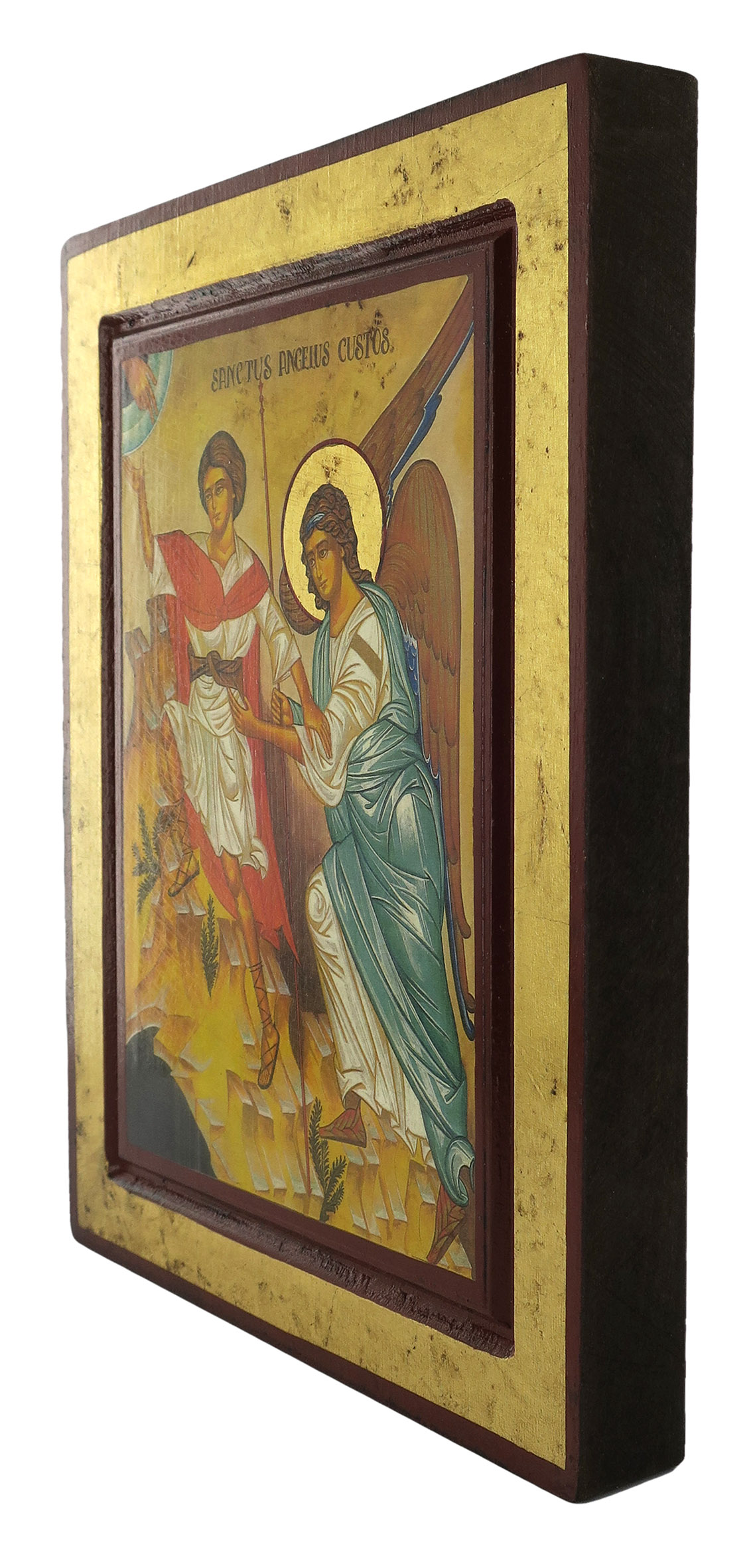 Icona Angelo Custode, Icona in Stile Arte Bizantina, Icona su Legno Rifinita con Aureole, Scritte e Bordure Fatte a Mano, Produzione Greca - 24 x 18,5 Cm